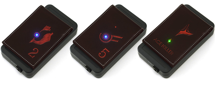 LEDライトを搭載したカラータイマーモチーフのパーツが、自動改札機や電子マネー決済機などにかざすと光るレザーパスケース。