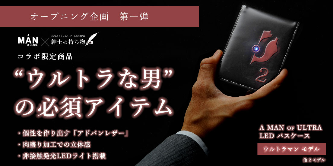 オープニング企画第一弾としまして「日常の世界にウルトラな男を創り出す」コンセプトブランド、A MAN of ULTRA(アマンオブウルトラ)とのコラボ商品『A MAN of ULTRA LEDレザーパスケース』を販売中です。